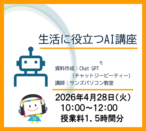 2026年4月28日火曜日 10:00~12:00お楽しみ講座「生活に役立つAI講座」開催です!!詳細は「お楽しみ講座」のページをご確認ください。